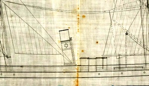 当時小菅丸は中越汽船の所有で明治21年の広告には石濱/函館/伏木間に就航とある.写真から推測される垂線間長,船名録より絞り込み得る3檣の汽船,側面図[資3539]及び模型写真[資2838]等より小菅丸の可能性が高いと推定 |